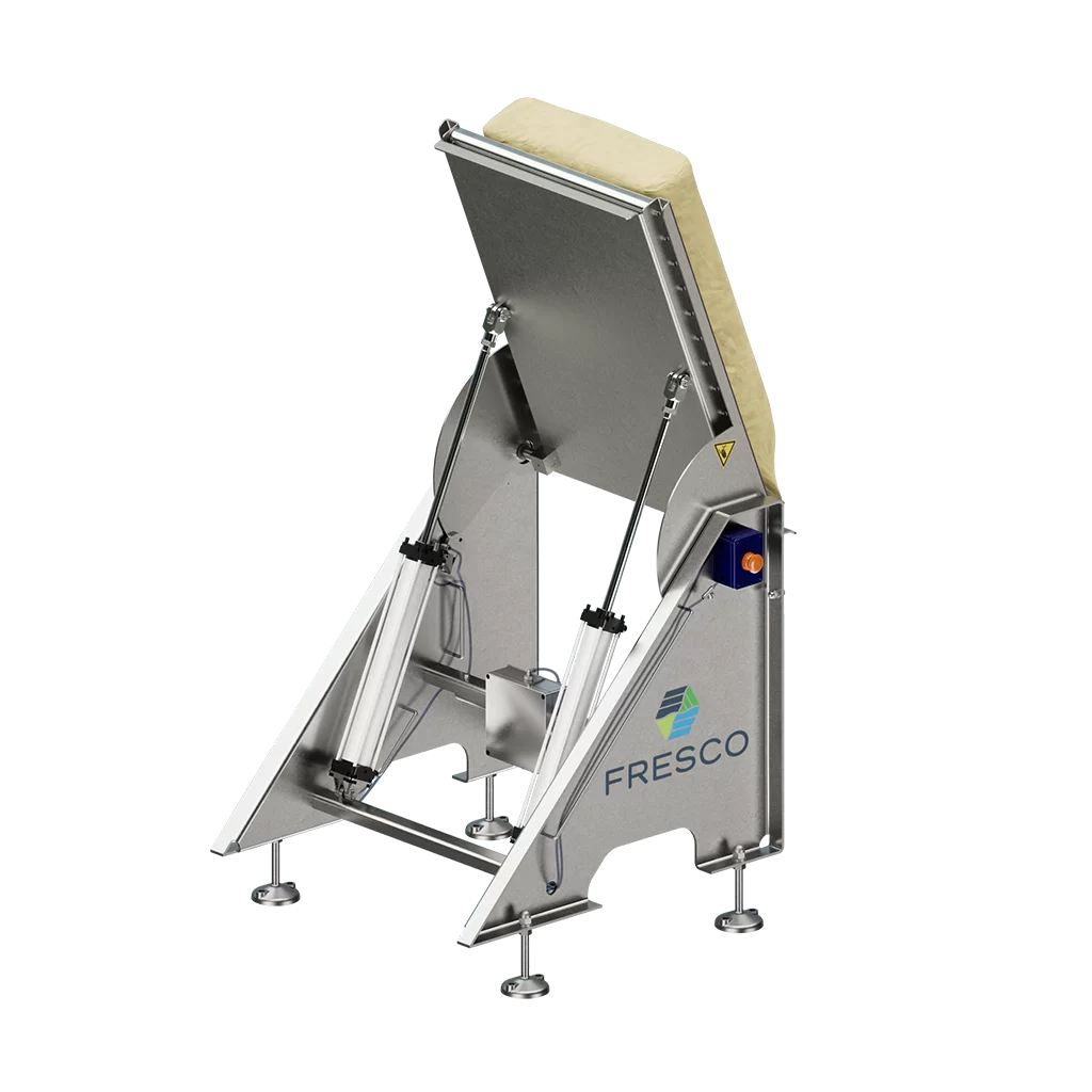 The Fresco Bag Flipper is designed to facilitate the ease of removing the outer layer of a 25kg Kraft Paper Bag. It provides an ergonomic means for the operator to cut and remove the paper, without straining, by flipping the bag using pneumatic actuation. The operator places the bag on the flipper and partially removes the paper outer from the top of the bag. The pneumatic actuation button is then pressed which flips the bag while the operator is retaining the paper outer. As the bag flips, the paper is removed from the bag leaving the products contents restrained in the plastic liner. This is then fed via conveyor to the downstream process. The operator places the waste paper in a bag compactor or similar equipment.