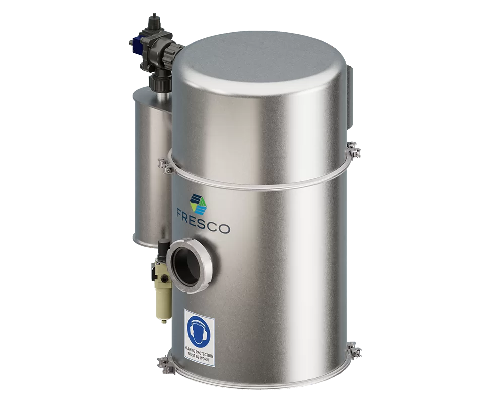 The Fresco Bin Vent is designed for sanitary and non-sanitary control of dust in surge hoppers which are subjected to gravity filling of dry powders and granules. Typical applications of bin vents include usage on surge hoppers fitted with a rotary valve and positive pressure conveying system. Selection of filters is based on the product type, it’s a cartridge type with normal filtration efficiency of 99.999% on 0.5-micron material. Filter access is provided through top removal restrained by a stainless steel quick clamp on the clean side of the plenum.